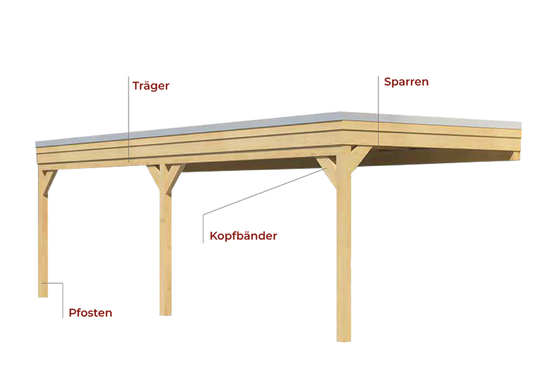 Unsere Holz-Carports bestehen aus Wand- und Fußpfette, Sparren, Pfosten und je nach Modell aus zusätzlichen hinteren Pfosten, Querstreben und Kopfbändern.Hier am Beispiel "Wandanbau"