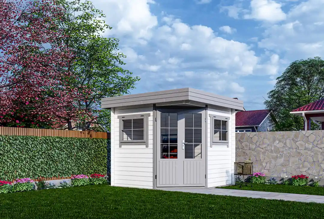 Modernes Gartenhaus mit „Flachdach“ aus hochwertigem nordischen Fichtenholz.