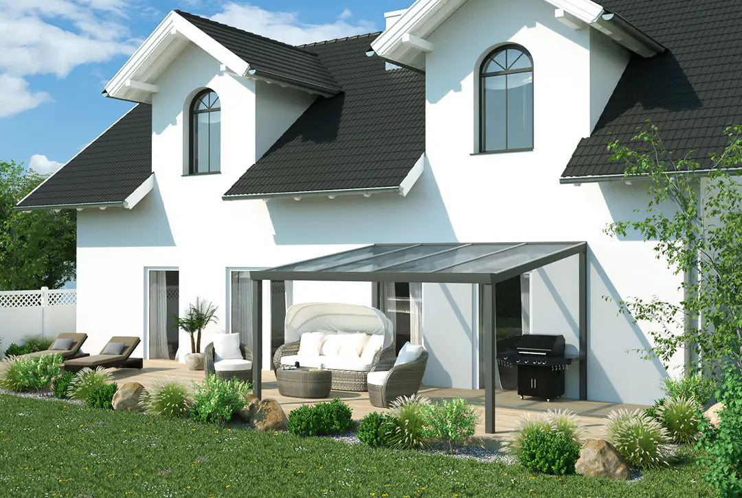 Hergestellt aus robustem Alu, das für seine Langlebigkeit bekannt ist, und in einem stilvollen grau gehalten, ist diese Überdachung eine attraktive und praktische Lösung für deine Terrasse. Ob für gemütliche Abende im Freien oder als geschützter Bereich für Pflanzen und Möbel