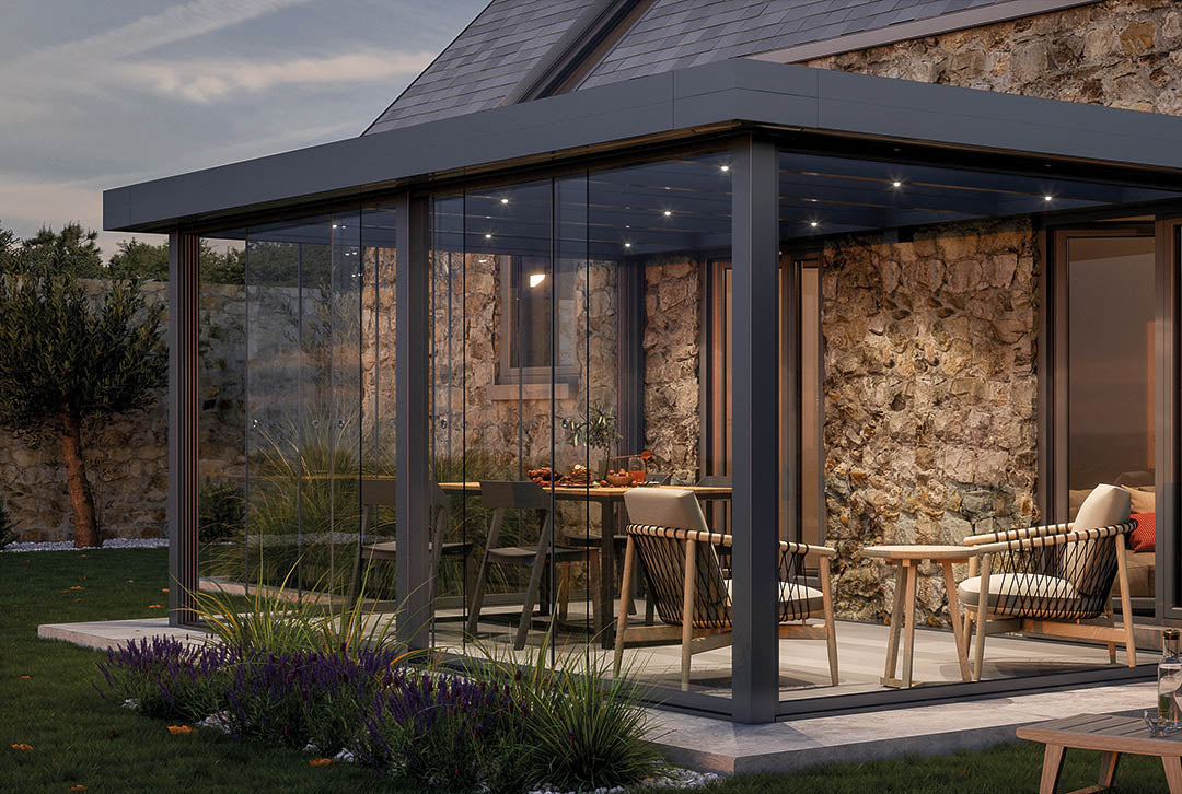 Du kannst eine Flatroof-Überdachung jederzeit mit Glasschiebewänden nachrüsten. Anders als bei standardmäßigen Terrassendächern werden hierbei keine Keilfenster benötigt.